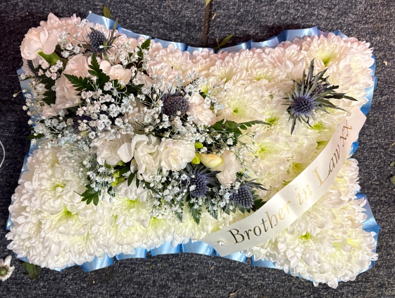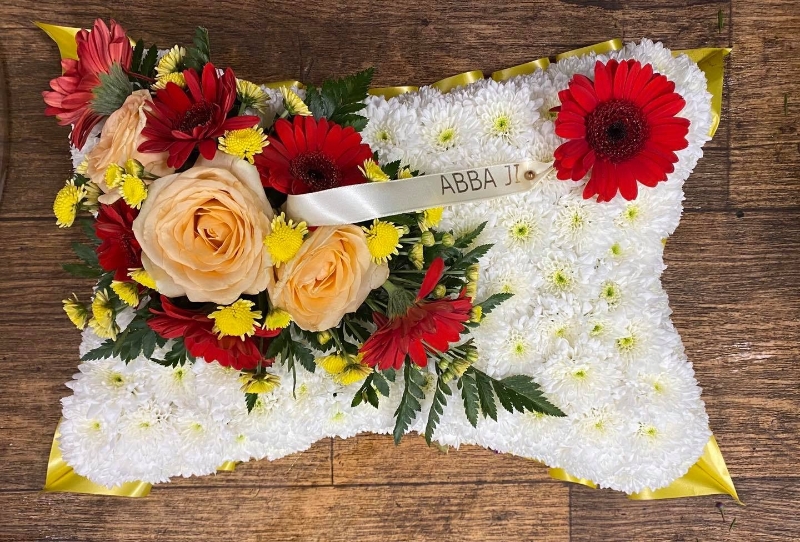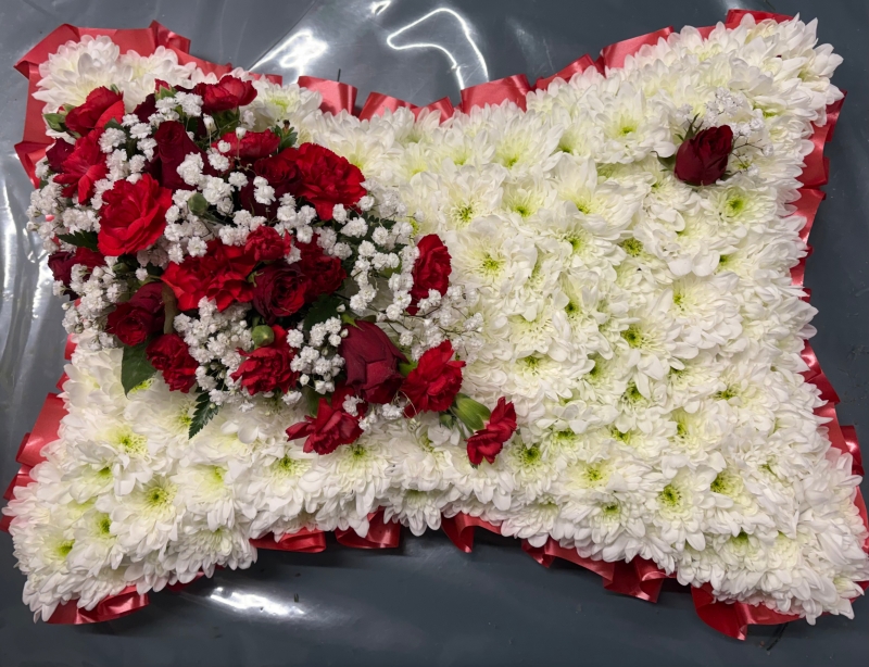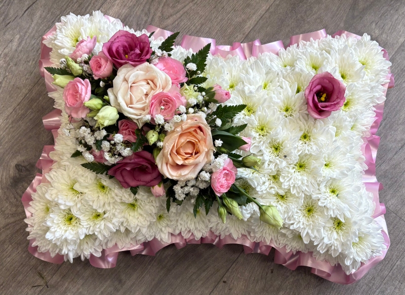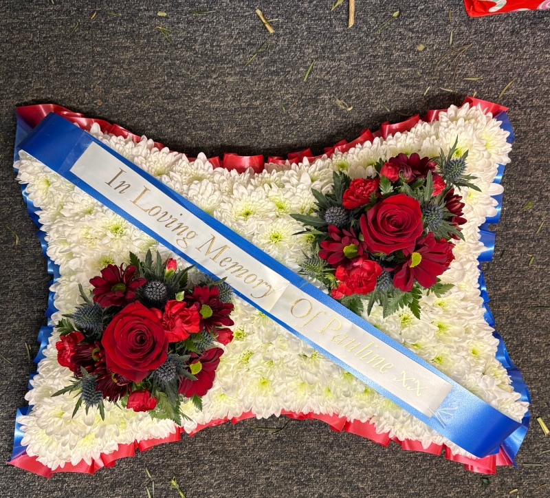 Pillow Based in Xanth with either a ribbon or foliage edge and a flower spray in the corner. can be done in a range of colours and sizes