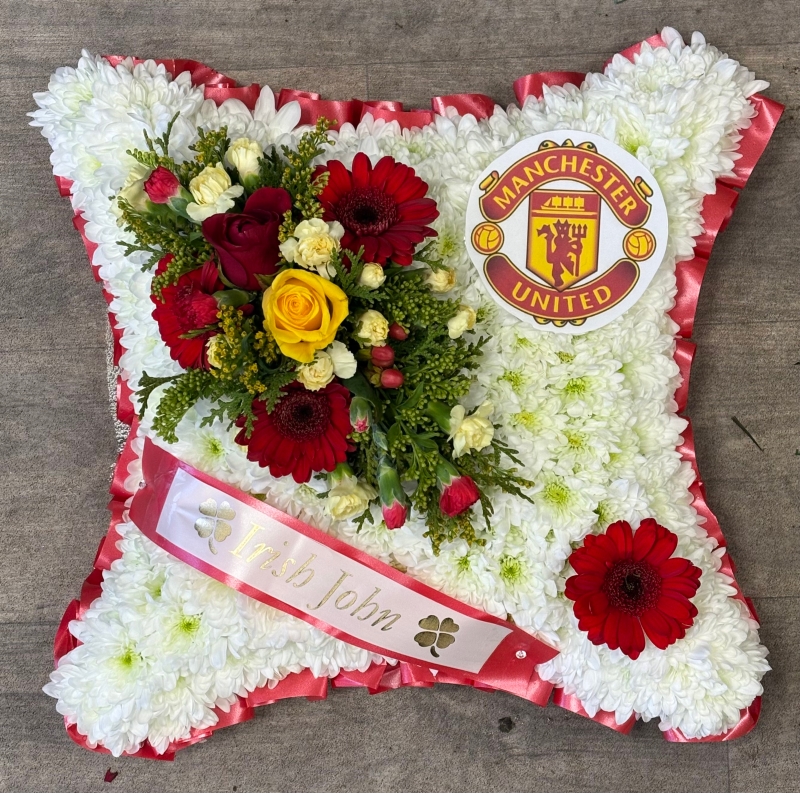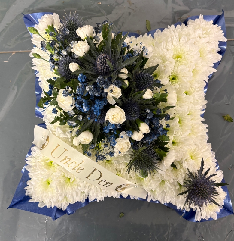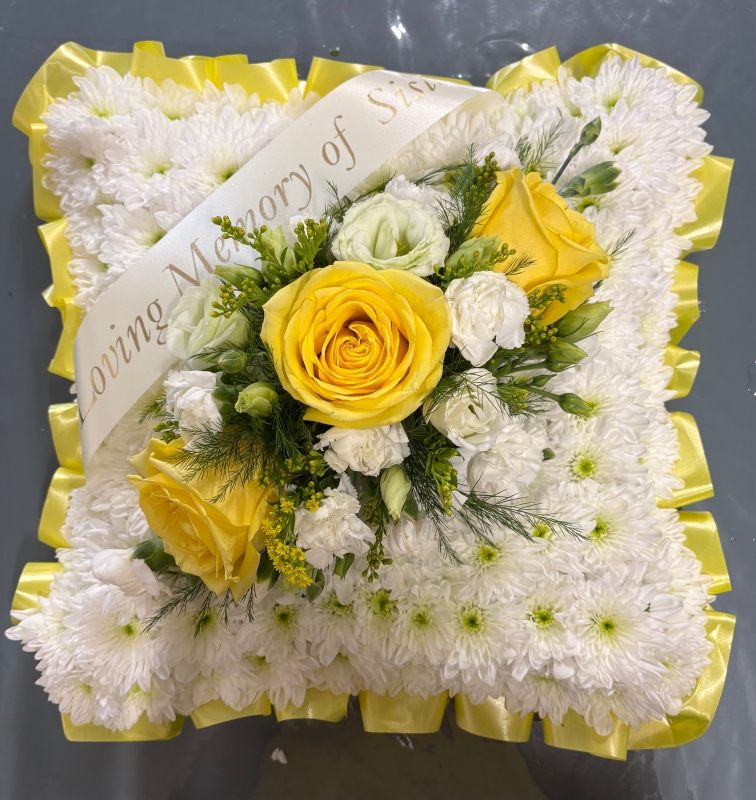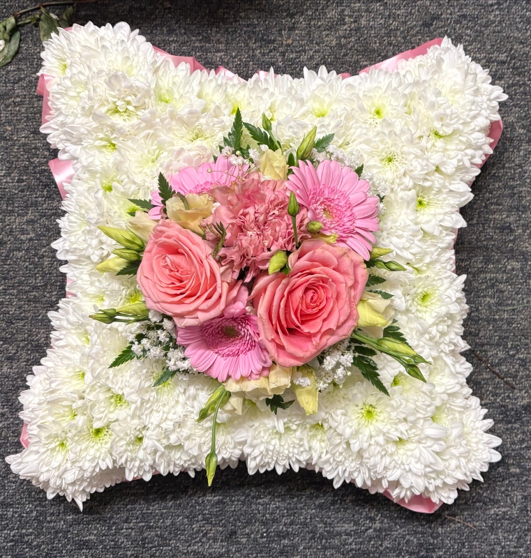 A cushion shape design with either a ribbon or foliage edge, based in xanth with a flower spray in the corner.