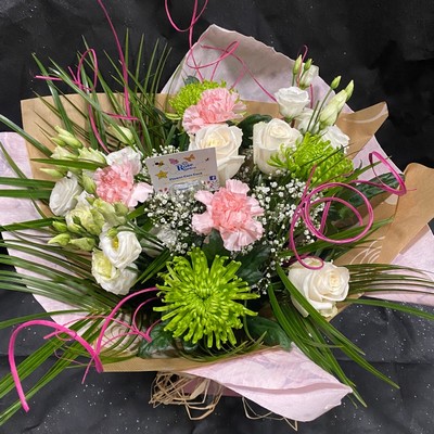 Our Amore Bouquet contains pink carnations , green blooms, white lisianthus , white avalanche roses , gyp and foliage wrapped in beautiful compostable flower wrap and presented as an Aqua bouquet ready arranged in water. A stunning display arranged by our skilled florists.