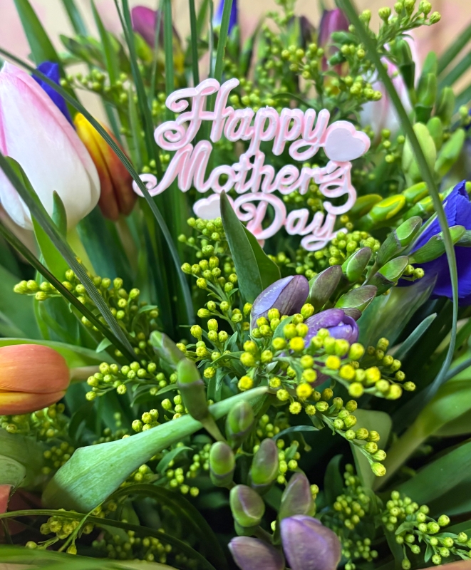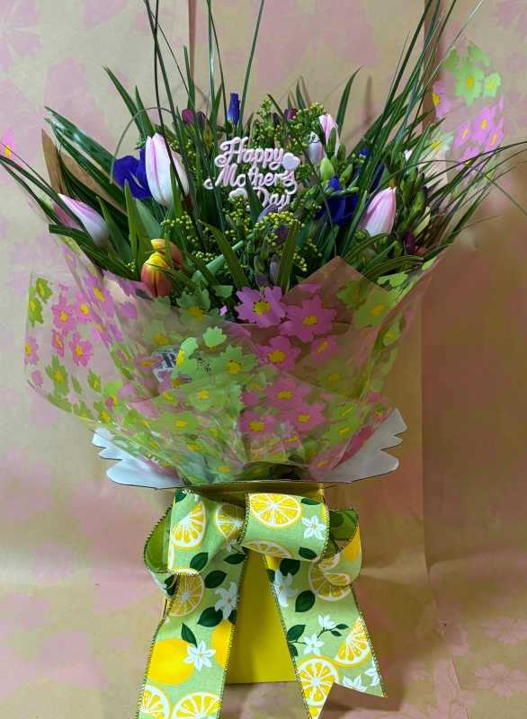Spring Sensation filled with tulips, freesia, iris and solid, arranged by our skilled florists.
