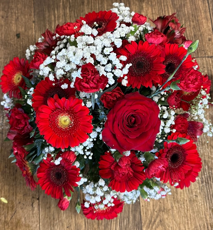 Posy of mixed seasonal flowers and foliages arranged in oasis in a plastic bowl. any colour choice , any size. Please choose colour choice from drop down menu