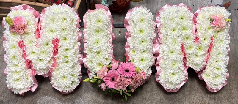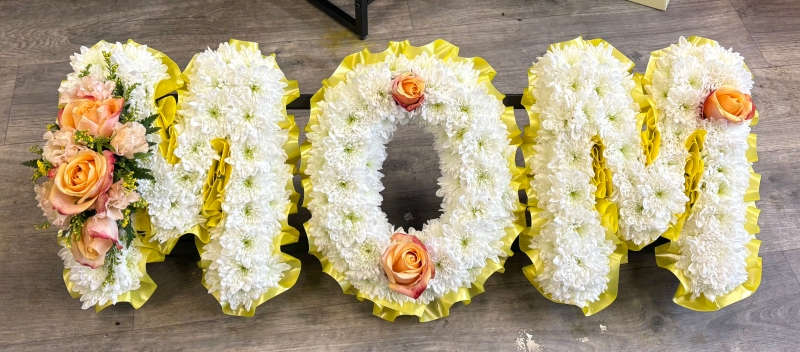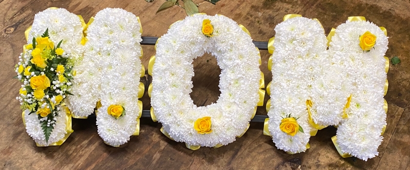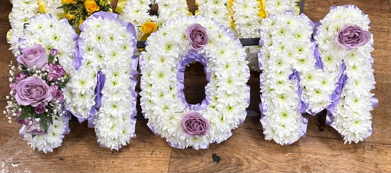 Based letter tributes with ribbon edge. Based in xanth with ribbon edge and a flower cluster on 1 letter.