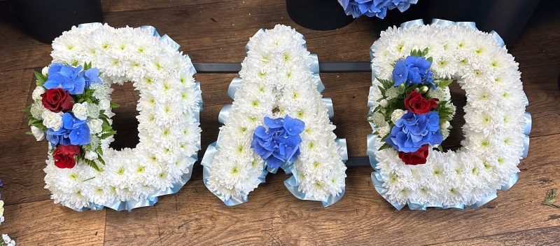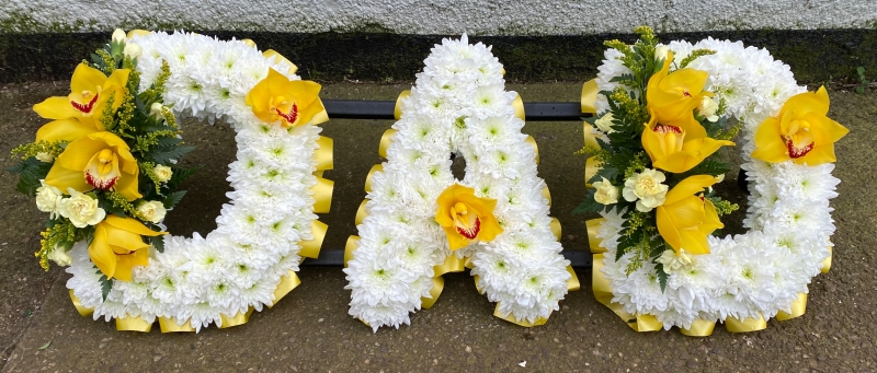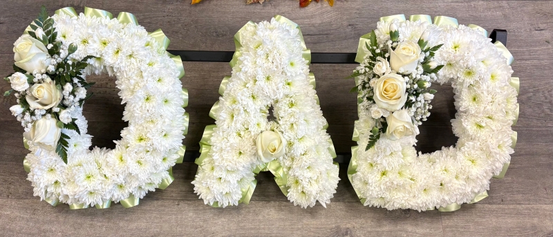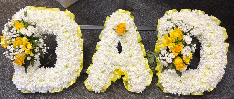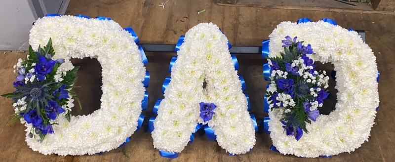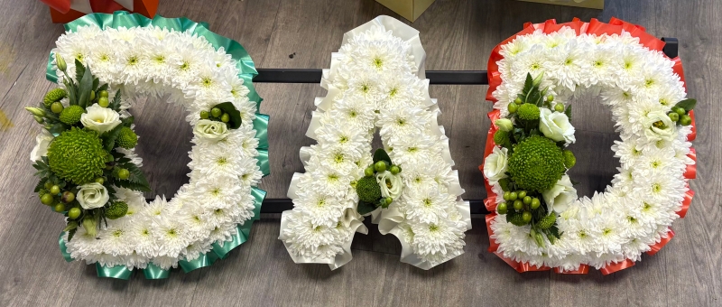 Based letter tributes with ribbon edge. Based in xanth with ribbon edge and 2 flower clusters on the D's