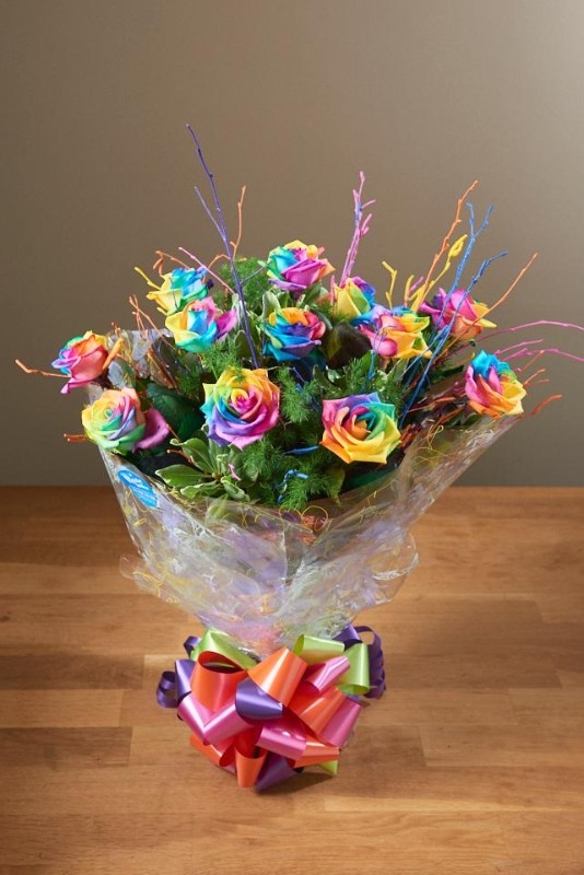 12 Beautiful Rainbow Roses with mixed Seasonal foliage . This Quirky Tied Design delivers something a little bit different. The multi coloured petals adds a little fun. The Roses are cleverly Dyed & Does not impact on the longevity, we've even had them last up to 3 weeks!